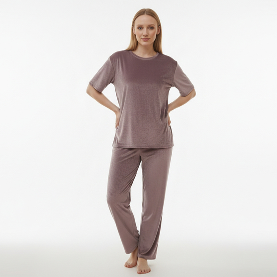 Комплект двойка: футболка и брюки. Изделие изготовлено из велюра на основе хлопка.