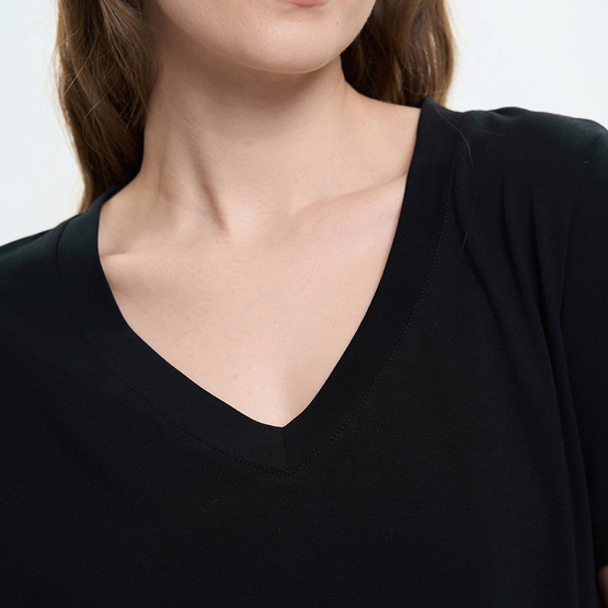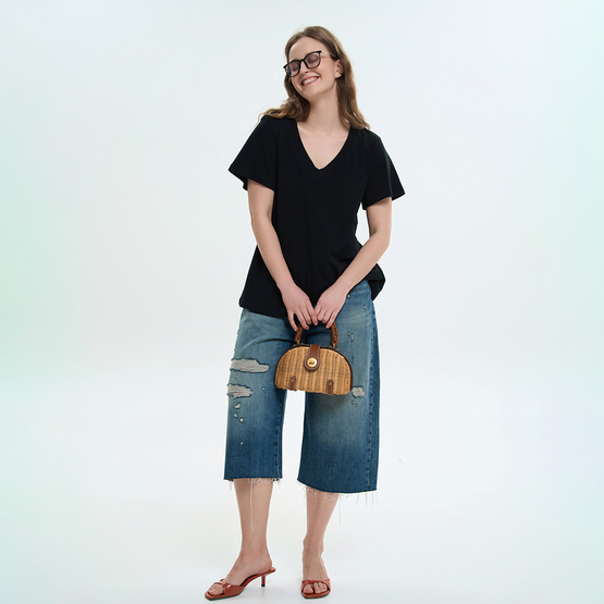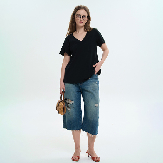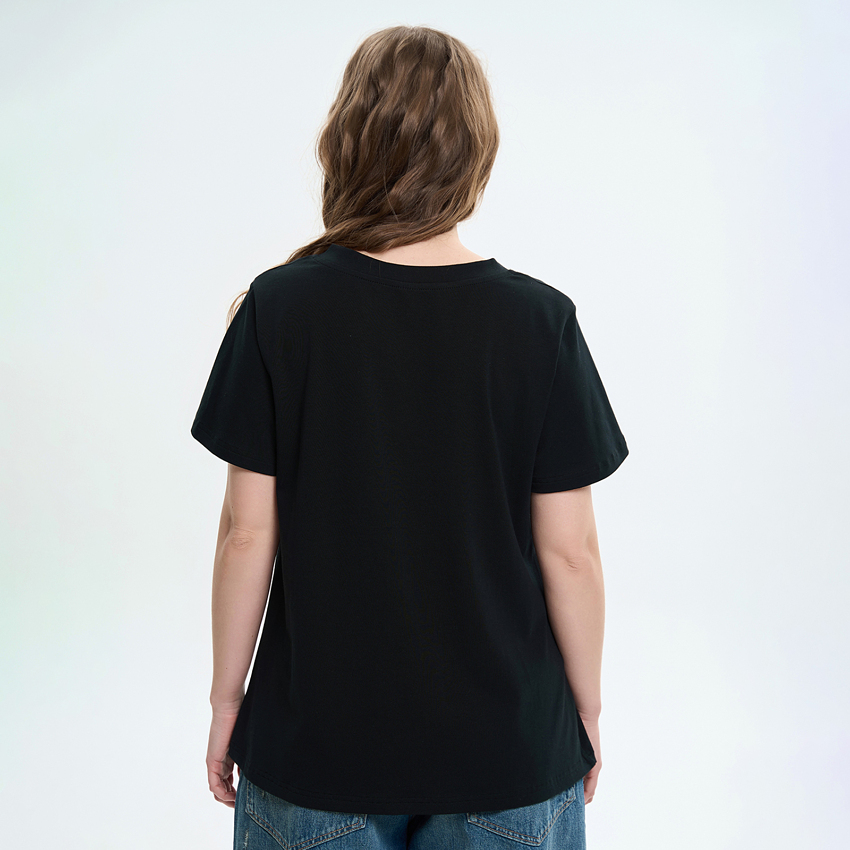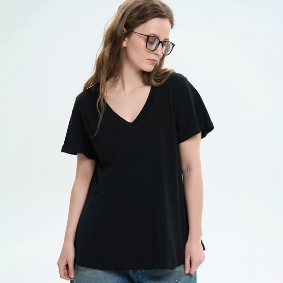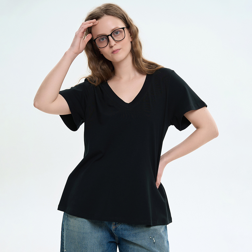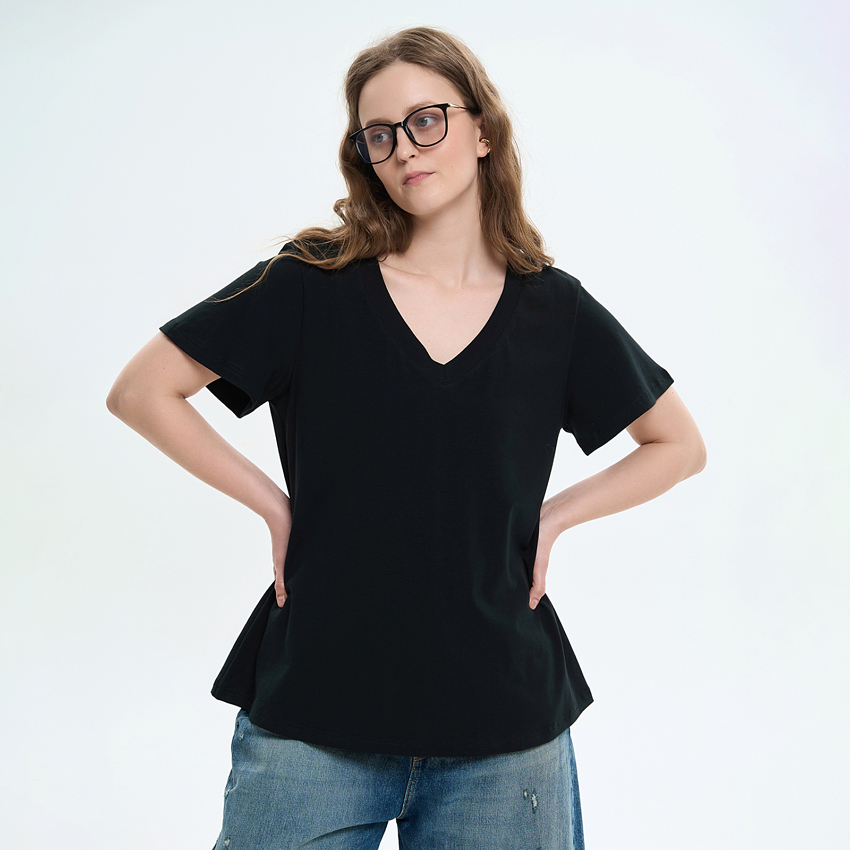 Женская футболка расширенного силуэта сочетает комфорт и легкость. Модель выполнена из мягкого трикотажного полотна, приятного к телу и удобного в повседневной носке. Футболка имеет свободный крой с расширением к низу, что создает эффект легкого клеша и придает модели динамику. Короткие вшивные рукава также расширены вниз, подчеркивая общую форму модели и обеспечивая свободу движений. V-образный вырез горловины визуально удлиняет шею и придает образу легкости. Благодаря продуманному крою и универсальному дизайну футболка легко сочетается с джинсами, брюками или юбками, формируя стильные повседневные образы.