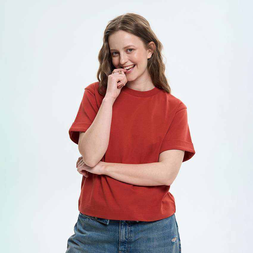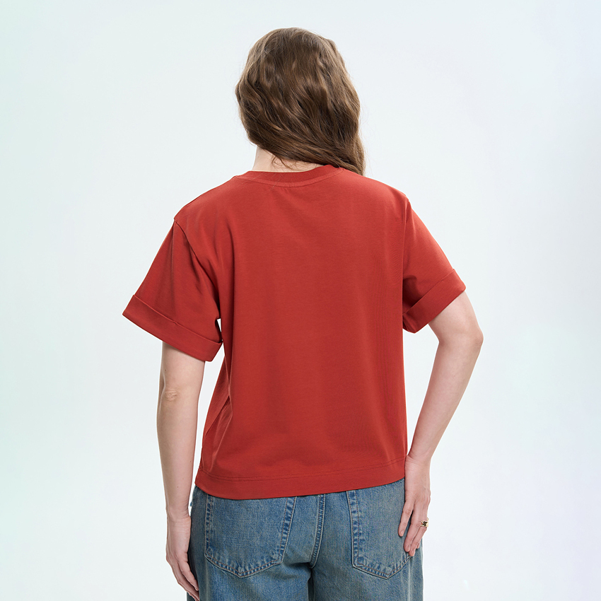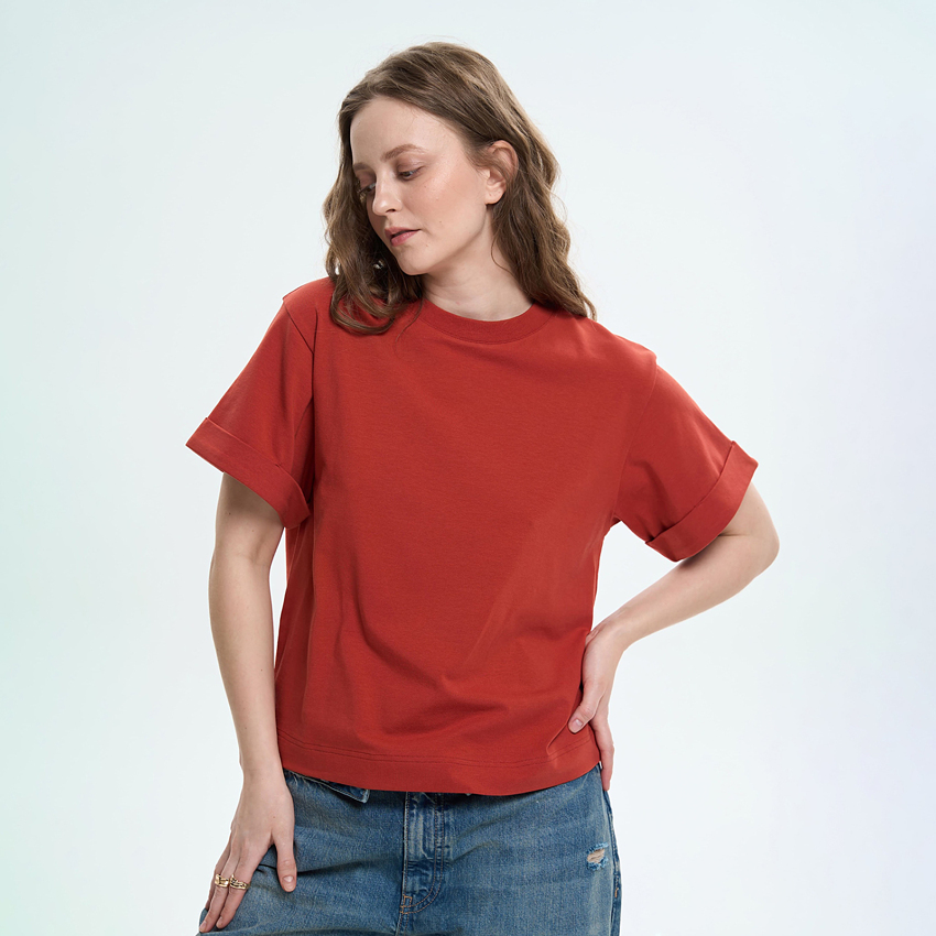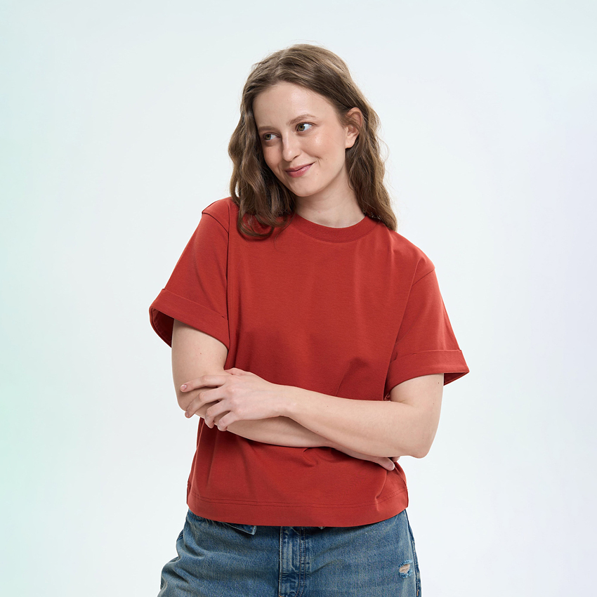 Женская футболка прямого силуэта сочетает комфорт и сдержанный современный дизайн. Модель выполнена из мягкого трикотажного полотна, приятного к телу и удобного в повседневной носке. Футболка имеет свободную посадку и широкие короткие рукава, придающие образу легкости и непринужденности. Круглый вырез горловины обеспечивает классический вид, а отложные манжеты по низу рукавов формируют аккуратный акцент и подчеркивают конструкцию изделия. Благодаря универсальному крою, модель легко сочетается с джинсами, брюками или юбками, создавая комфортные повседневные образы.