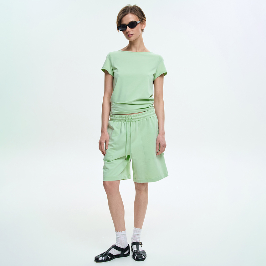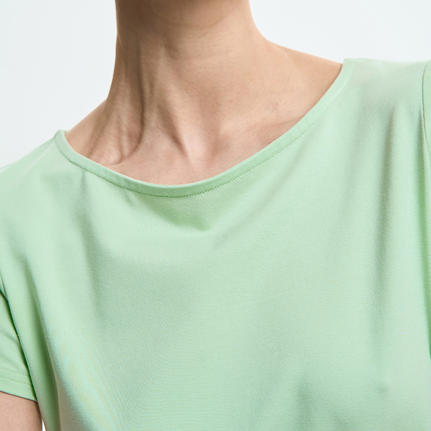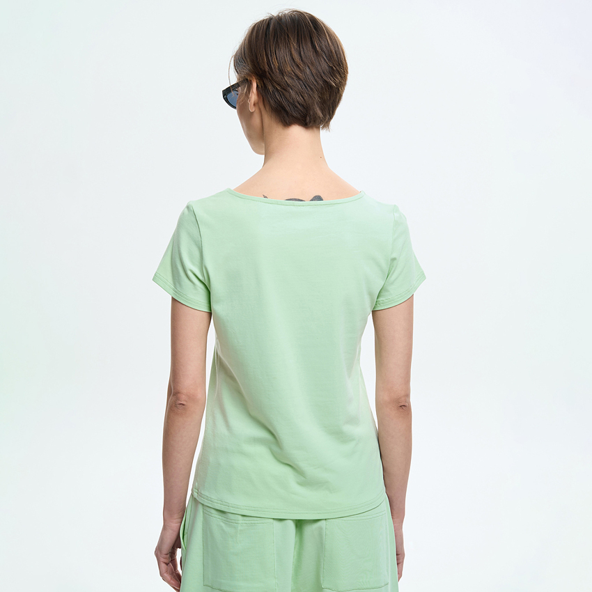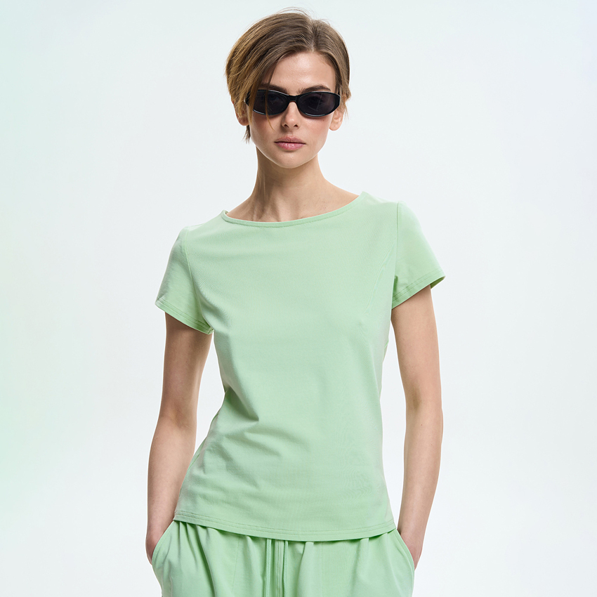 Женская футболка полуприлегающего силуэта сочетает комфорт и элегантную простоту. Модель выполнена из мягкого трикотажного полотна, приятного к телу и удобного в повседневной носке. Футболка имеет аккуратную посадку по фигуре и короткие вшивные рукава, обеспечивающие комфорт и свободу движений. Вырез «лодочка» мягко подчеркивает линию плеч и придает образу утонченности и женственности. Лаконичный крой подчеркивает универсальность модели и делает ее уместной в разных стилизациях. Благодаря сдержанному дизайну, футболка легко сочетается с джинсами, брюками или юбками, формируя современные повседневные образы.