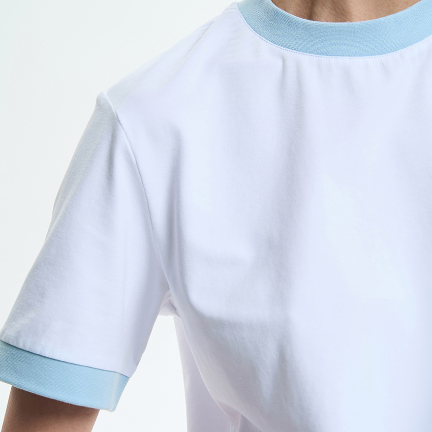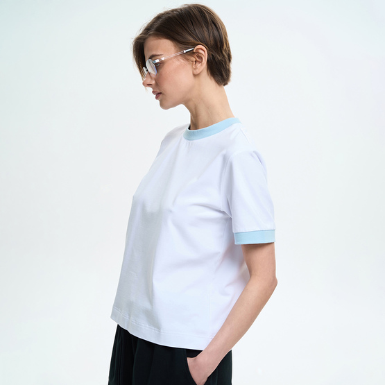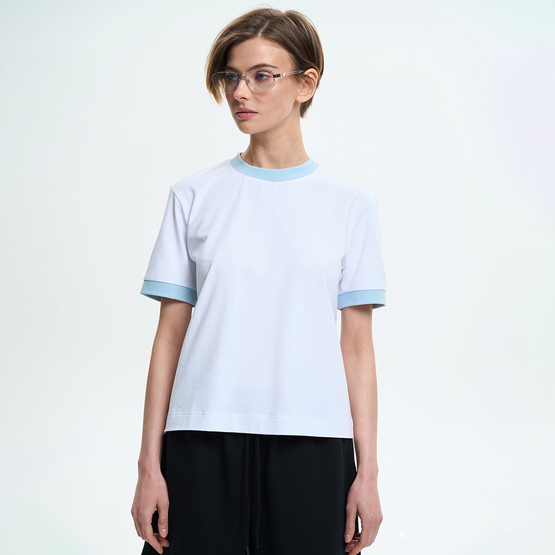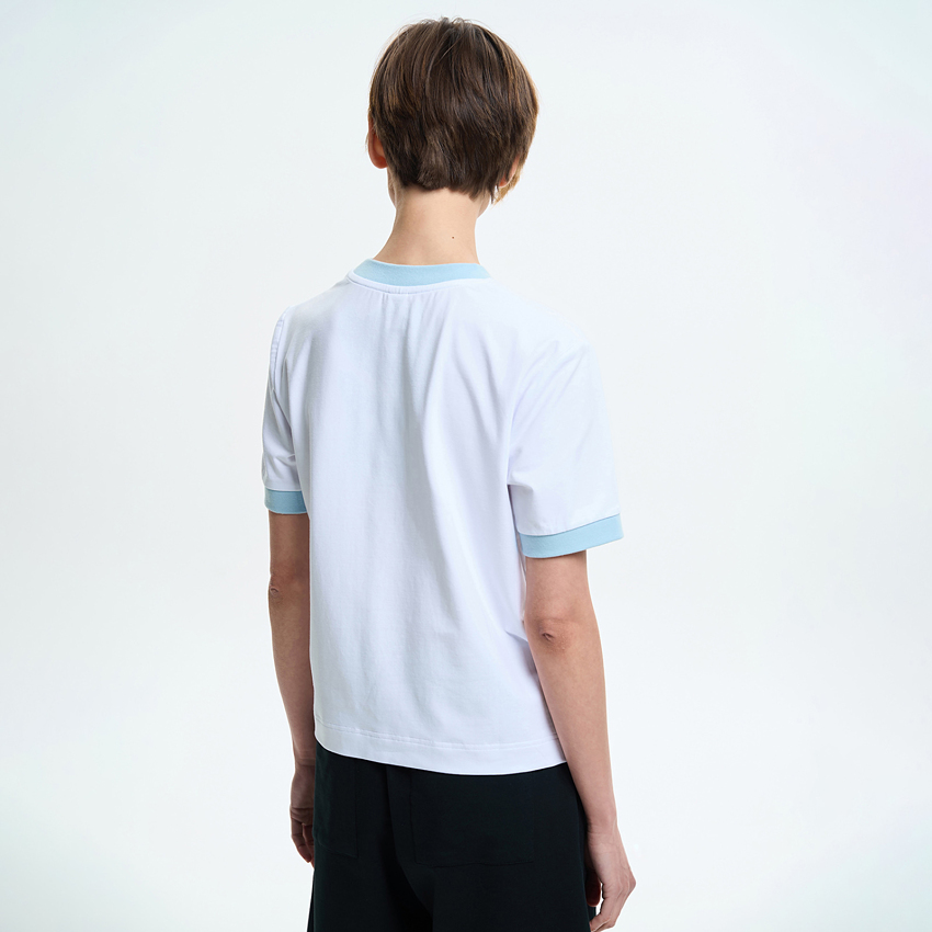 Футболка имеет свободную посадку и короткие вшивные рукава, обеспечивающие комфорт и свободу движений. Круглый вырез горловины отделан воротником контрастного цвета, который придает изделию выразительность. Манжеты на рукавах, выполненные из того же контрастного материала, формируют цельный дизайн и подчеркивают аккуратность деталей.