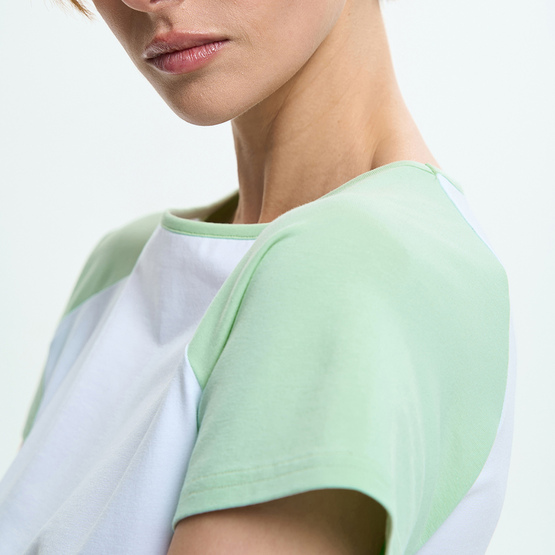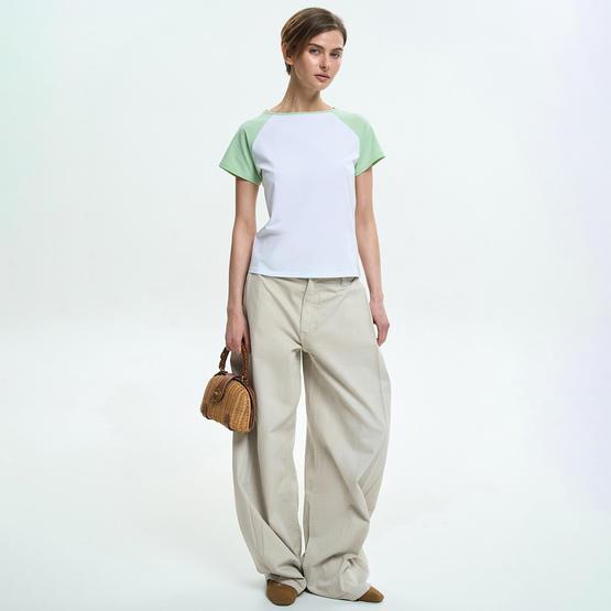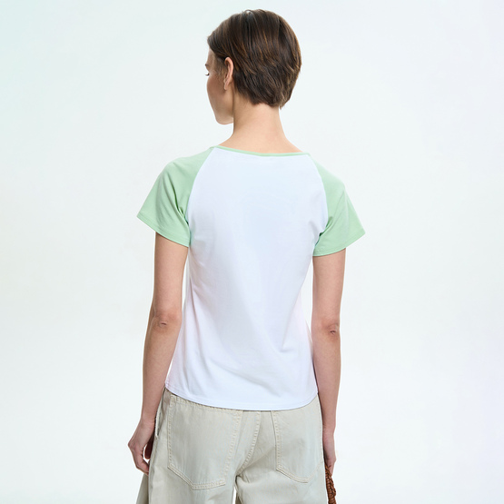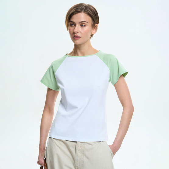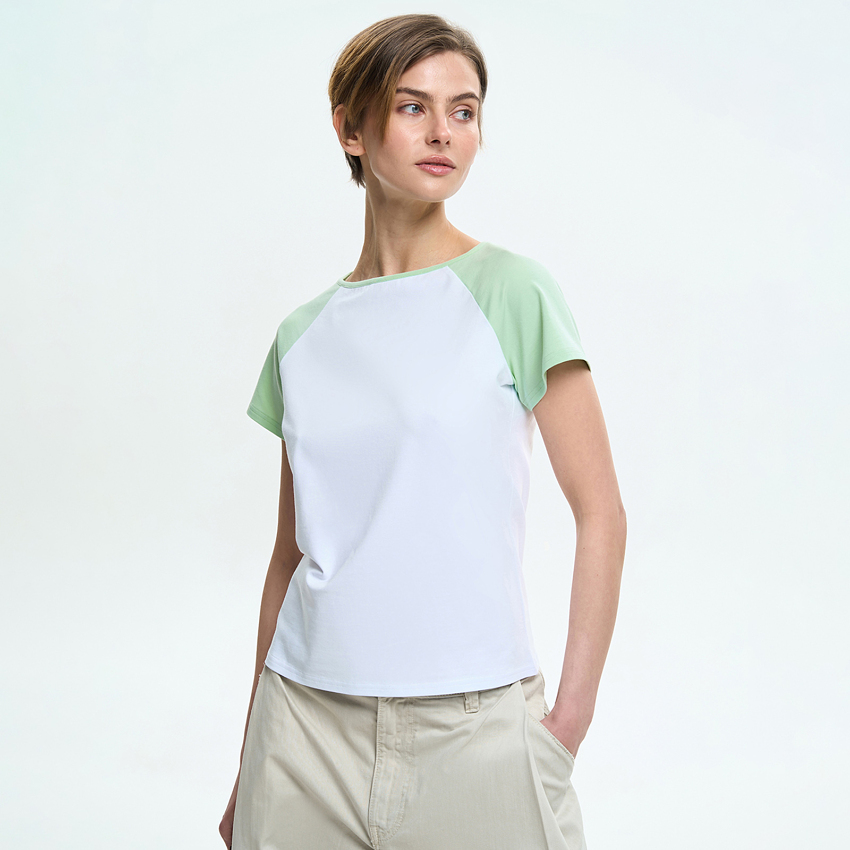Футболка имеет аккуратную посадку по фигуре и короткие рукава-реглан контрастного цвета, которые создают выразительный визуальный акцент и формируют мягкую линию плеча. Круглый вырез горловины подчеркивает классический вид модели и обеспечивает комфорт в носке.