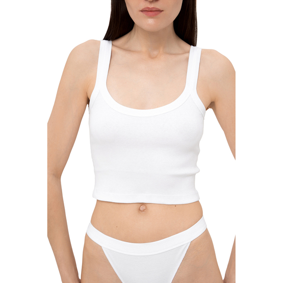 Укороченный женский топ в рубчик. На широких нерегулируемых бретельках. Идеальный вариант для спортивных и кэжуальных образов.
