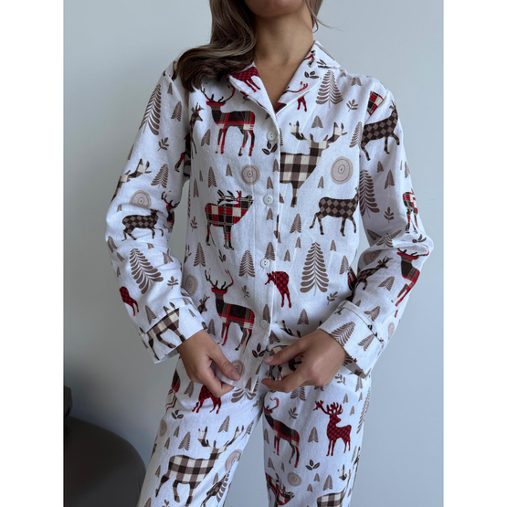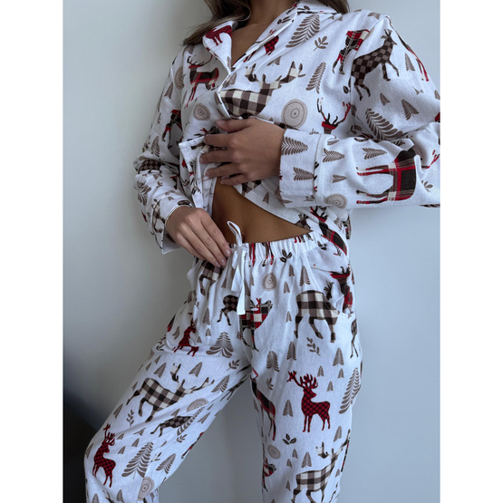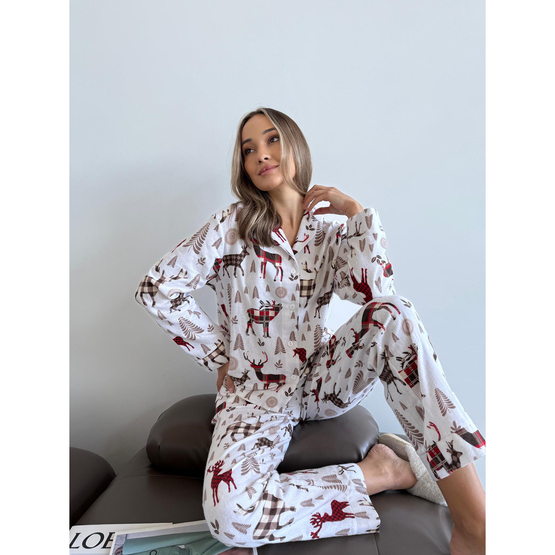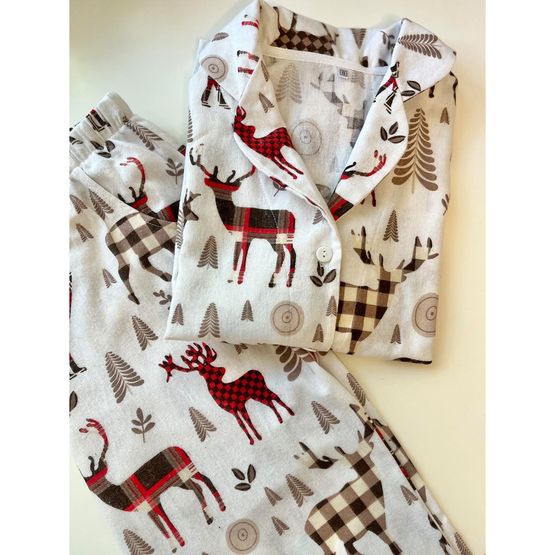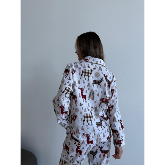Фланелевая пижама "Норди" - это воплощение уюта и скандинавского шарма! Воображения: уютная, мягкая, теплая фланель, нежно окутывающая тело, идеально подходит для холодных вечеров. Дизайн с оленями навевает атмосферу скандинавских зим, когда за окном заснежены пейзажи, а ты дома в полном комфорте.