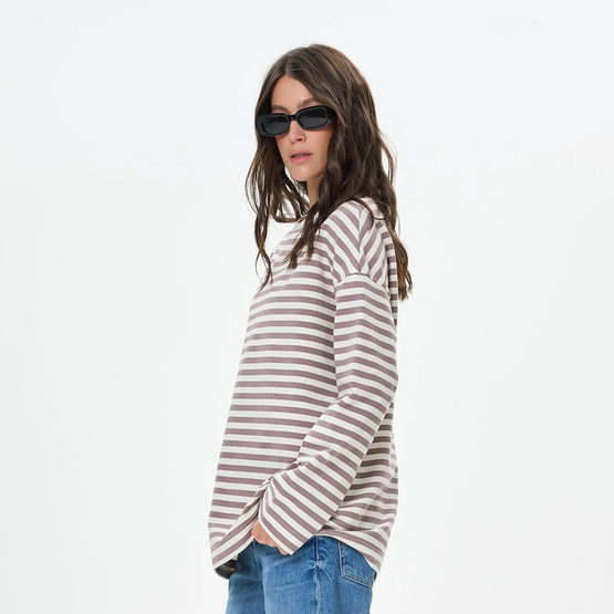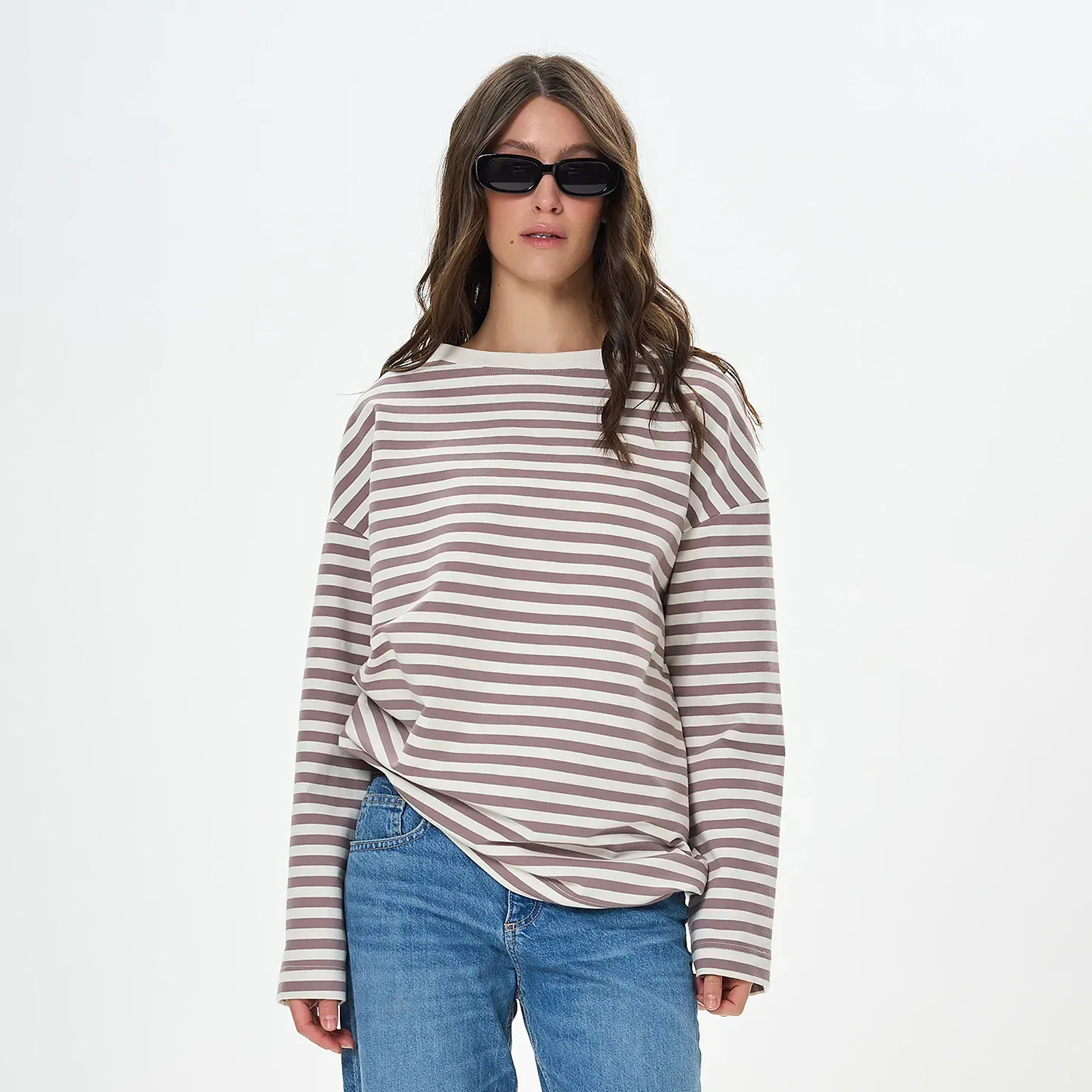 Женский лонгслив оверсайз кроя сочетает комфорт и непринужденный стиль. Выполненный из мягкой двунитки в полоску, он имеет прямой силуэт и спущенный рукав, придающий образу легкости и свободы. Отсутствие манжетов делает модель еще более расслабленной и универсальной. Лонгслив отлично сочетается с джинсами, широкими штанами или шортами, создавая современные повседневные образы.