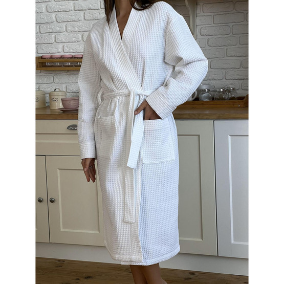 Белый женский вафельный халат создан для вашего комфорта и заботы о себе. Легкий и удобный вафельный халат идеально подходит для дома после душа или ванны, а также станет незаменимым спутником в бане, сауне или на отдыхе в спа.