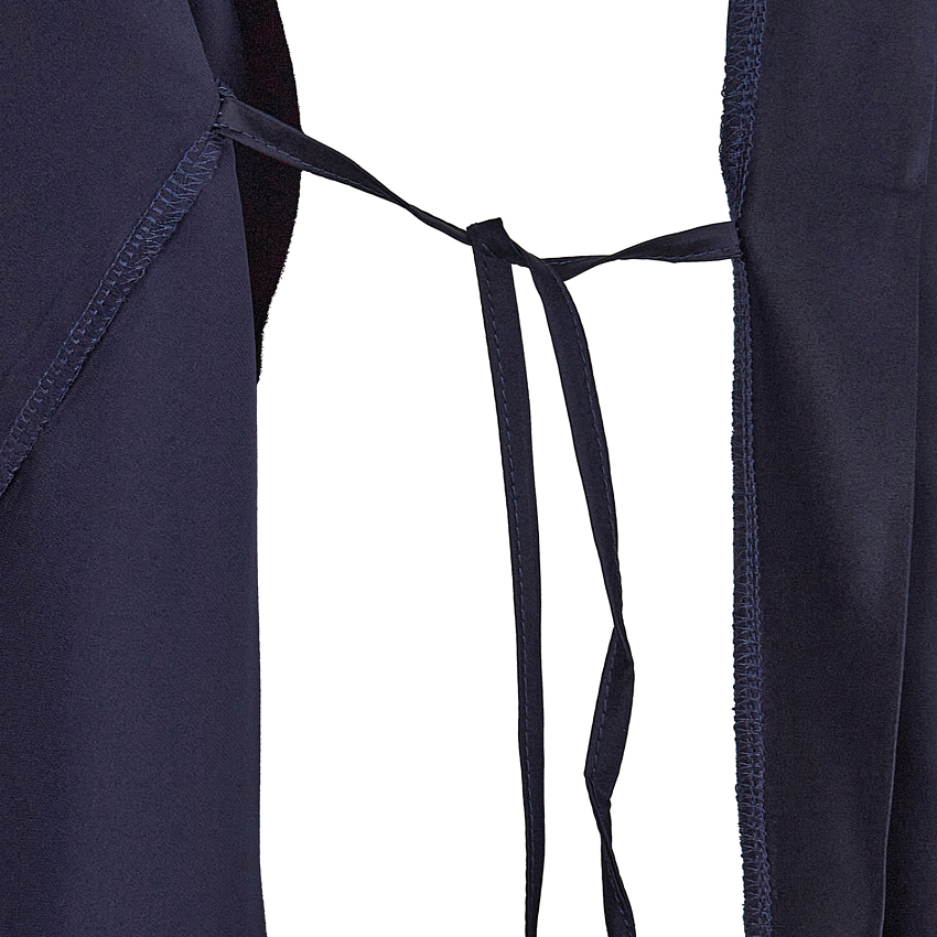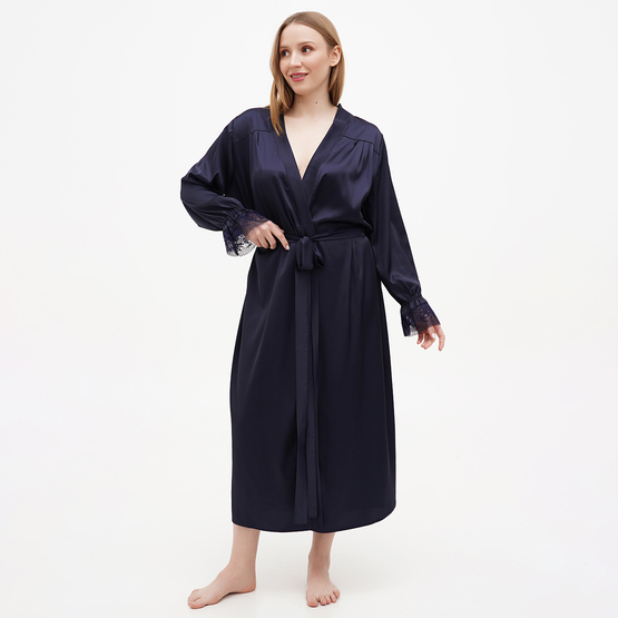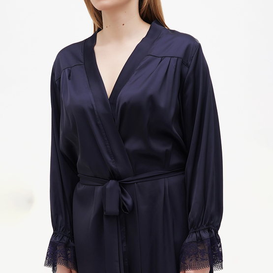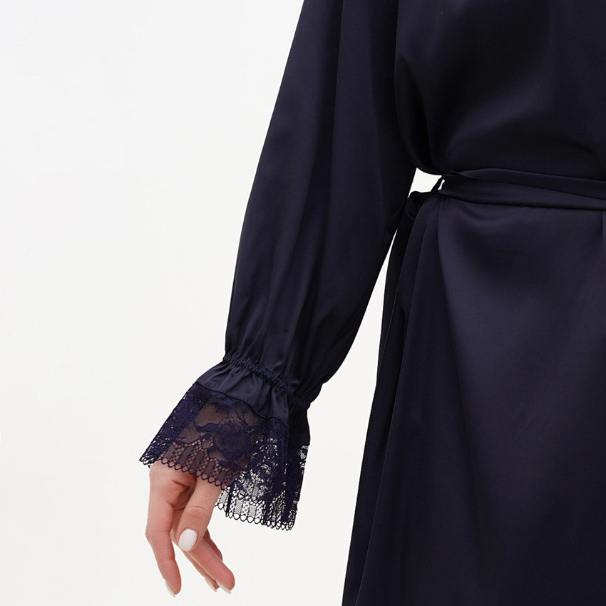 Халат длинный, на запах с пояском. Рукав 8/10 декорирован кружевом
