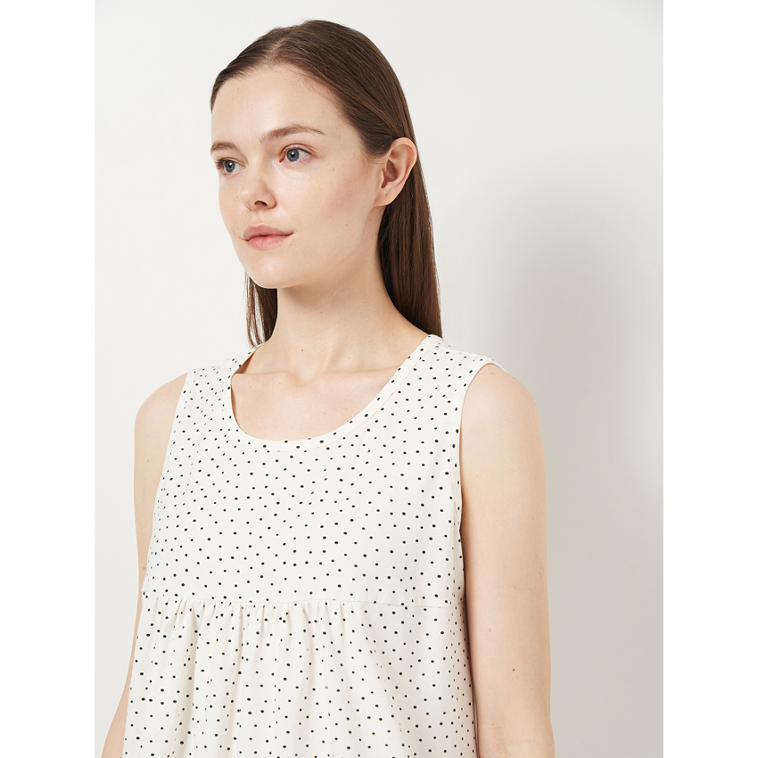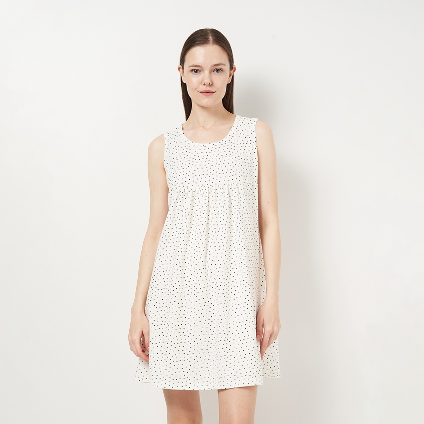 Короткое пижамное платье без рукавов с мелким принтом изготовлено из легкой и мягкой ткани. Свободный крой обеспечивает свободу движений. Собранное тонкими вертикальными складками под грудью, оно подходит любой фигуре. Материал Хлопок обеспечивает естественную вентиляцию и мягкость. Отличный выбор для разных сезонов. Рекомендации по уходу Рекомендуется стирать при температуре не выше 40°C, используя режим деликатной стирки. При ручной стирке избегать трения. Цветные вещи с хлопком в составе не рекомендуется сушить под прямыми солнечными лучами.