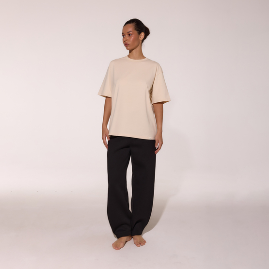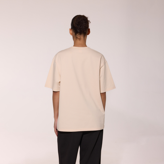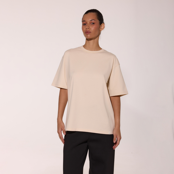 Классическая белая футболка в стиле оверсайз с круглым вырезом. Короткий широкий рукав.