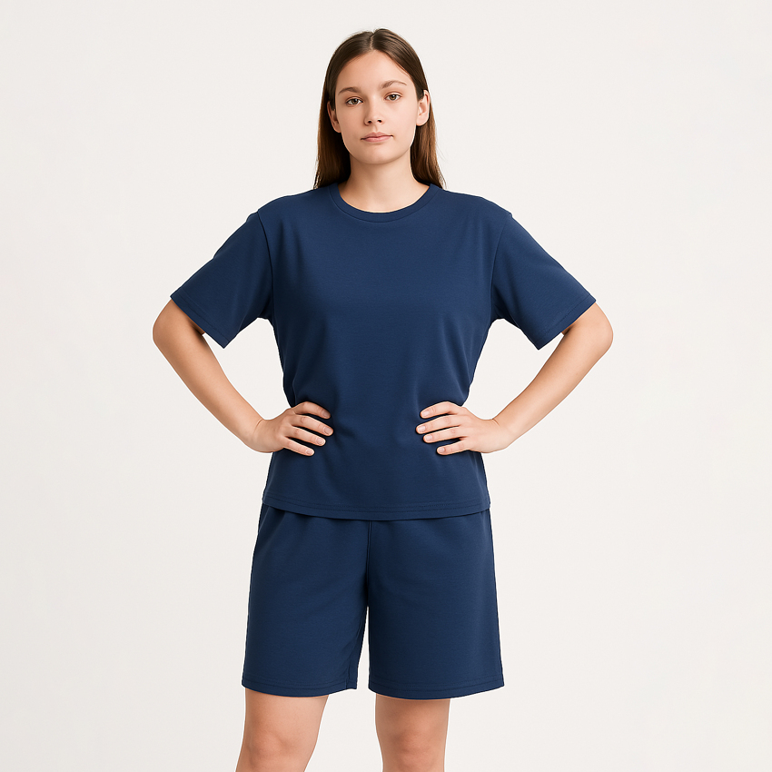 Футболка имеет прямой крой и короткие рукава с приспущенной линией плеча, что обеспечивает комфорт во время носки. Шорты также имеют прямой крой и надежную резинку, которая хорошо держится на бедрах.