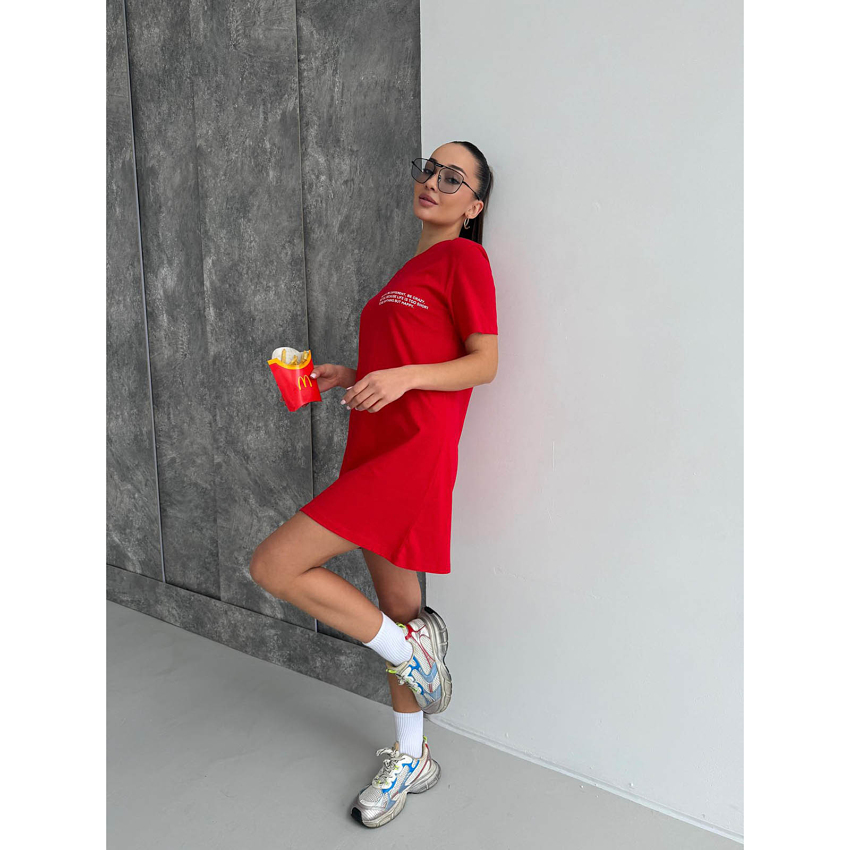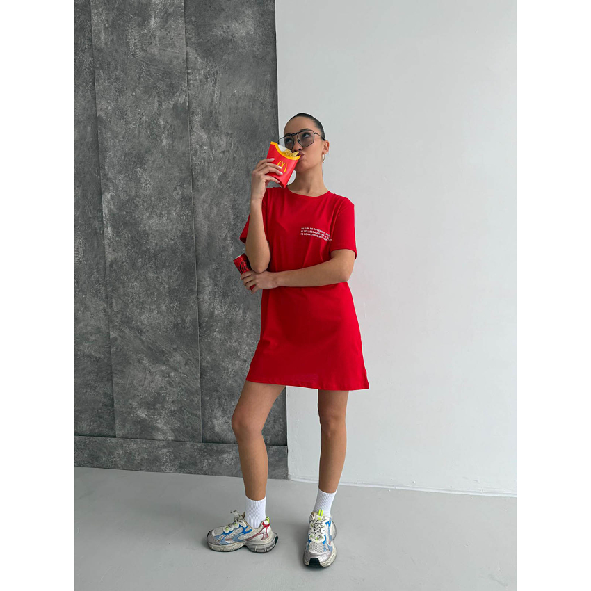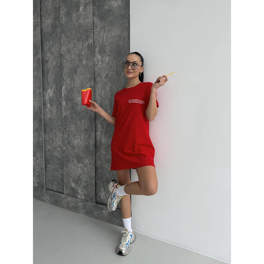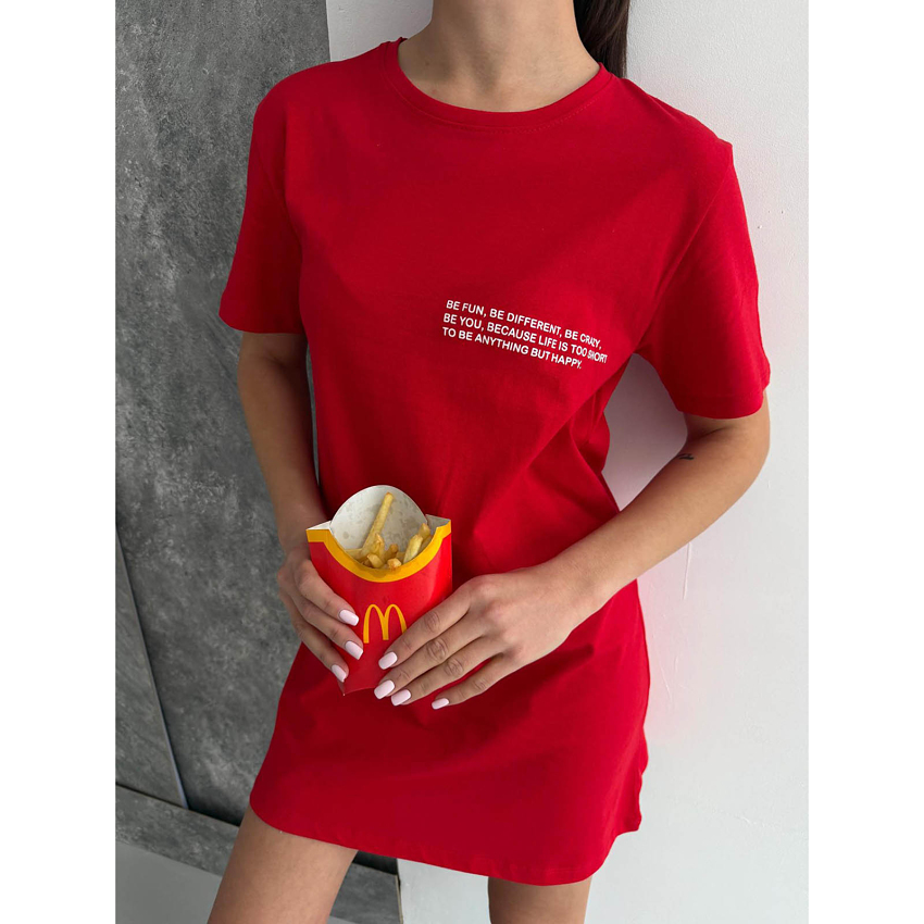 Эта футболка-туника в эффектном красном цвете создана для тех, кто любит привлекать внимание и излучать уверенность. Насыщенный оттенок придает энергии, а лаконичная жизнеутверждающая надпись на груди заряжает позитивом и напоминает: будь счастлива каждый день!