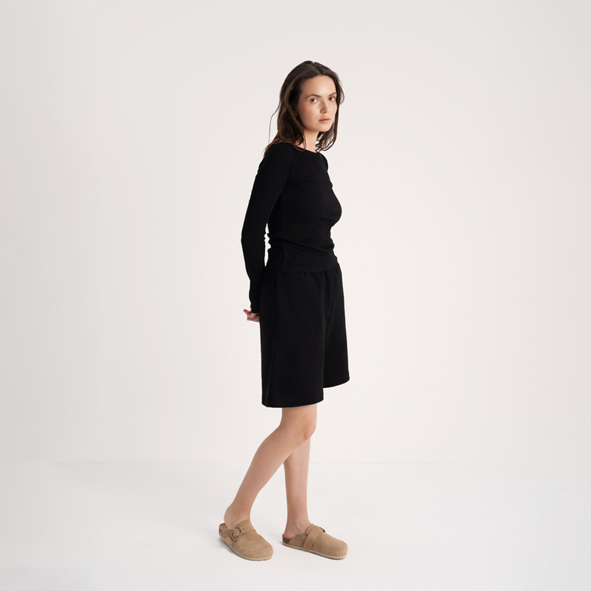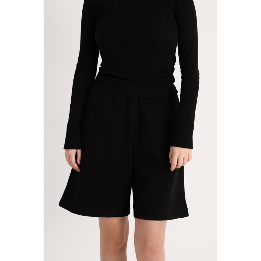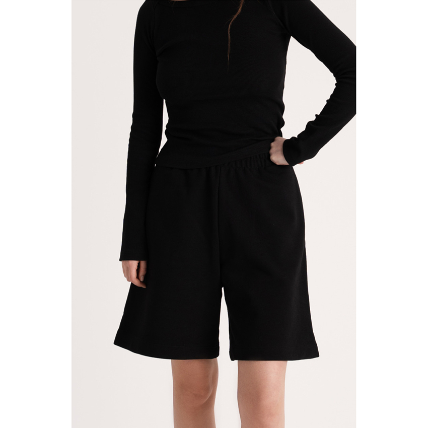 Женские шорты трапеция, длиной до колена. Свободные, прямого кроя с 2 карманами. Эластичный пояс с плоским шнурком для регулировки размера.