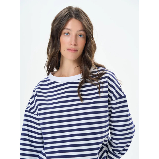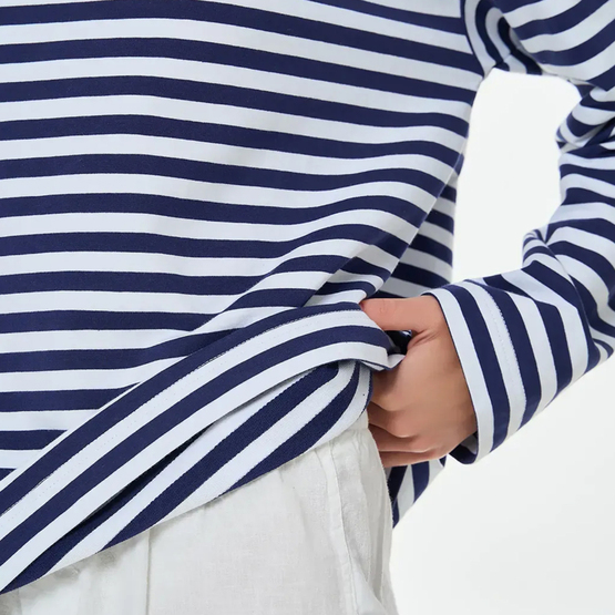 Женский лонгслив оверсайз кроя сочетает комфорт и непринужденный стиль. Выполненный из мягкой двунитки в полоску, он имеет прямой силуэт и спущенный рукав, придающий образу легкости и свободы. Отсутствие манжетов делает модель еще более расслабленной и универсальной. Лонгслив отлично сочетается с джинсами, широкими штанами или шортами, создавая современные повседневные образы.