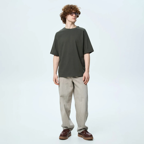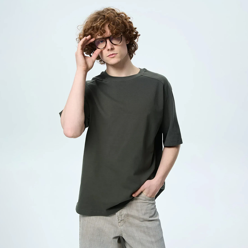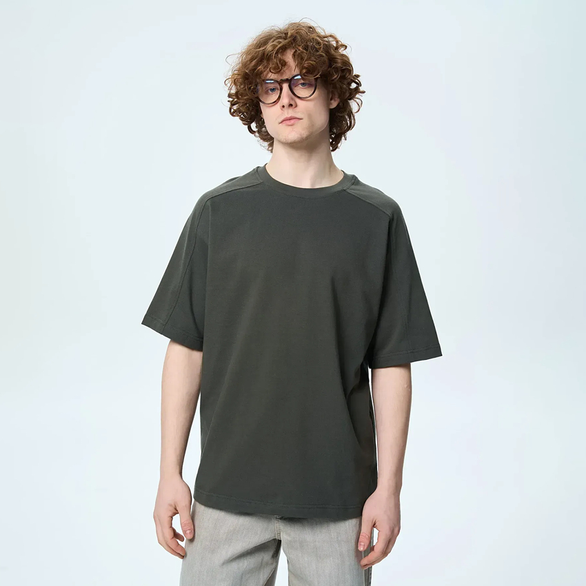 Стильна чоловіча футболка оверсайз крою - поєднання мінімалізму та виразних деталей. Модель має прямий силует і рукав реглан, що створює м’яку лінію плеча та додає свободи рухів. Верх пілочки, спинки та частина рукавів доповнені оздоблювальною деталлю з декоративними строчками, які підкреслюють конструкцію виробу та надають йому сучасного характеру. Ідеальний вибір для створення стильних повсякденних образів - легко поєднується зі спортивними штанами, джинсами або шортами.