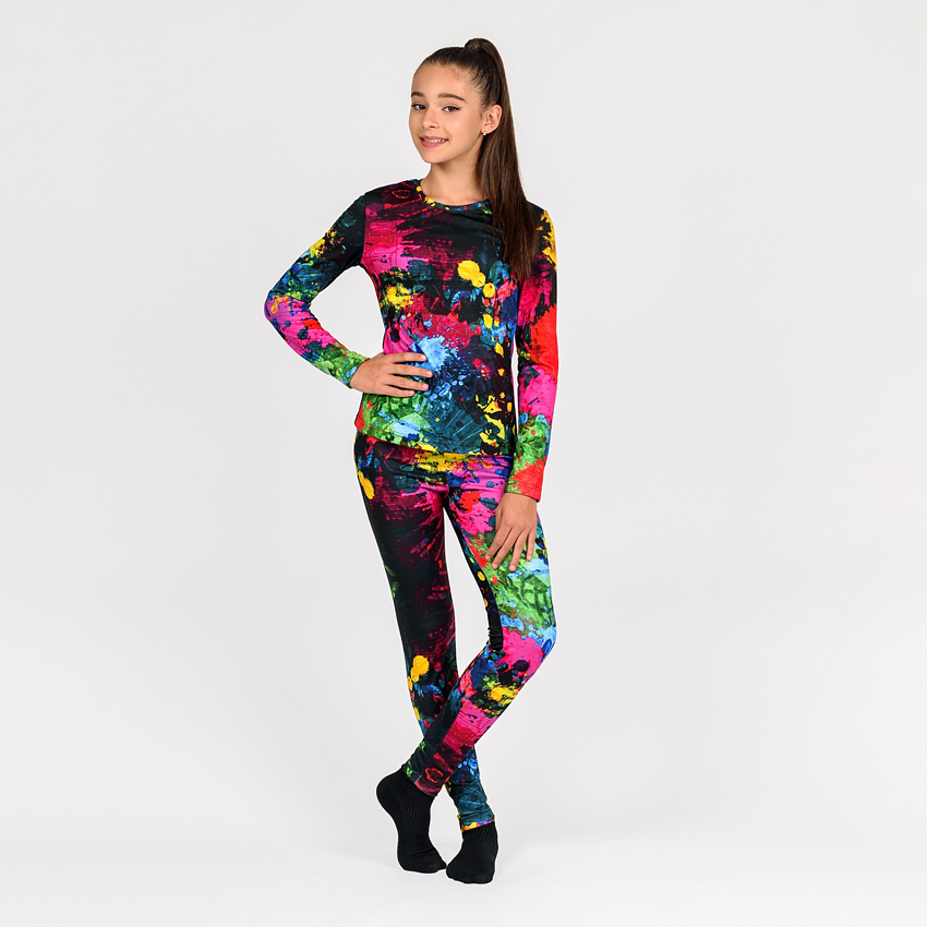 Унікальність цього комплекту полягає в інноваційній тканині термоначіс, яка дарує приємні тактильні відчуття, при цьому відмінно захищає від холоду та дозволяє шкірі "дихати". Принт, нанесений за допомогою сублімаційного друку, вражає яскравими неоновими плямами на чорному фоні. Цей динамічний дизайн, що поєднує яскраві кольори, немов створює сплеск енергії, додаючи позитиву та радості в кожен день. Неонові плями, що переливаються у світлі, надають комплекту сучасного і трендового вигляду, а також підкреслюють індивідуальність маленької модниці.