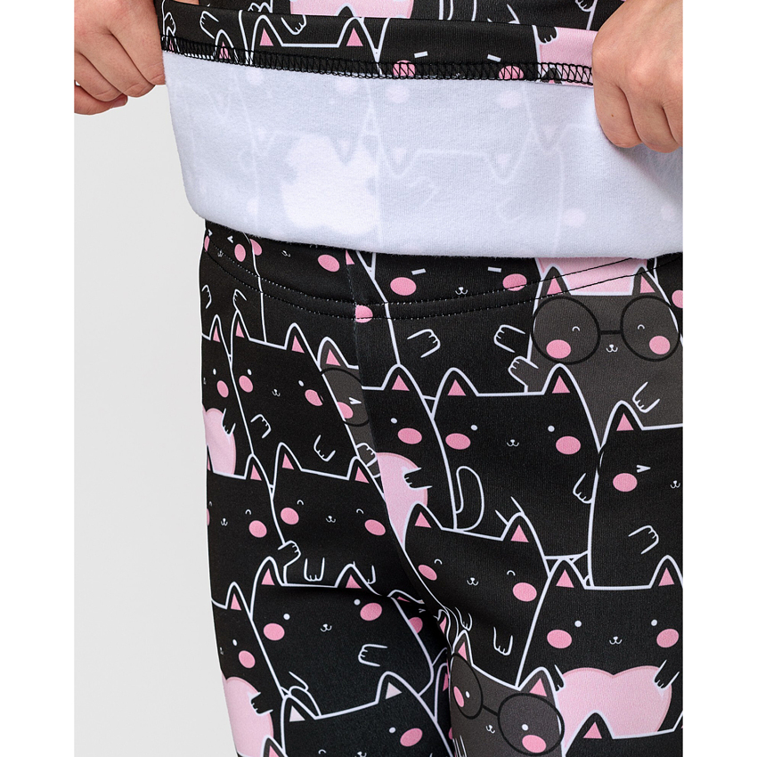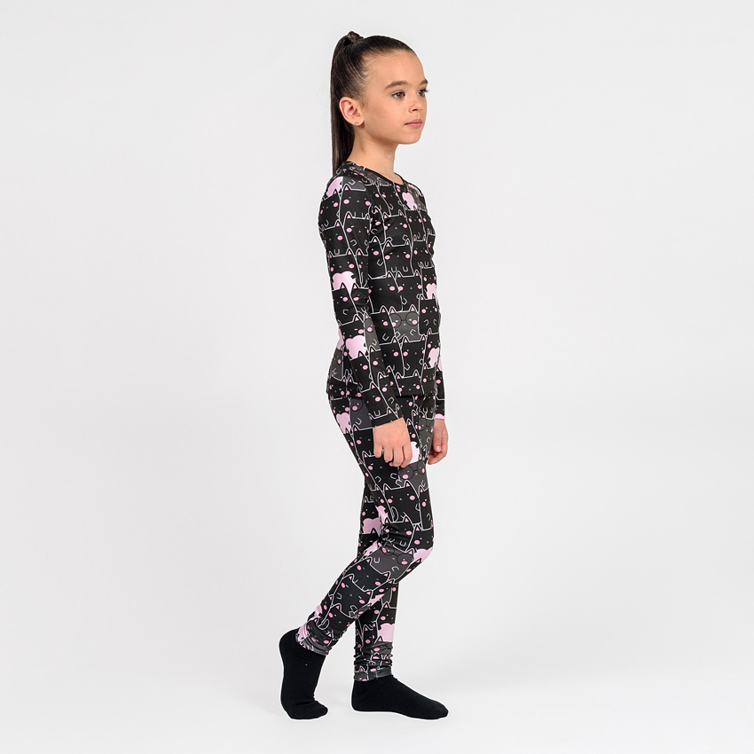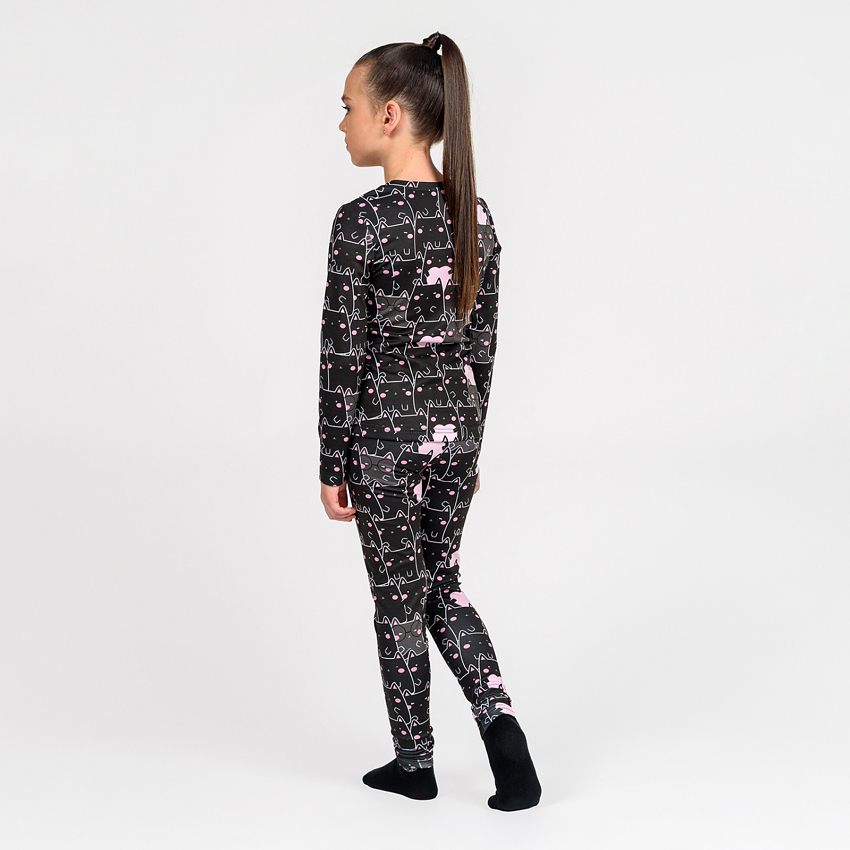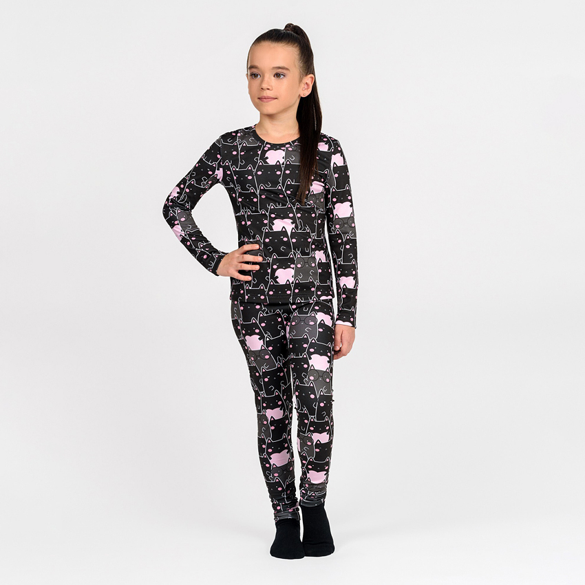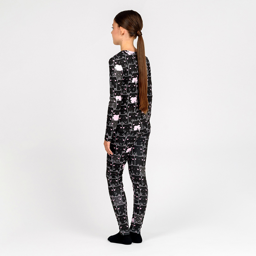Унікальність цього комплекту полягає в інноваційній тканині термоначіс, яка дарує приємні тактильні відчуття, при цьому відмінно захищає від холоду та дозволяє шкірі "дихати". Принт нанесений за допомогою сублімаційного друку, що гарантує його стійкість: малюнок не тьмяніє, не тріскається та залишається яскравим навіть після численних прань. Принт - чорні котики на чорному фоні, розмірний ряд від 98 до 146 розміру.