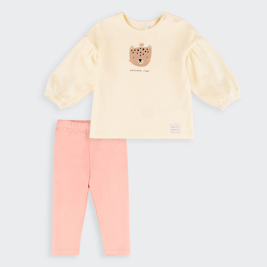 Цей чарівний комплект із кофтинки та легінсів створений для найкомфортніших моментів вашої малечі. Виконаний із м’якого інтерлоку зі 100% бавовни, він дарує ніжність дотику, забезпечує затишок і свободу рухів протягом усього дня. Ніжні кольори роблять цей костюм чудовим вибором як для щоденного носіння, так і для святкових моментів.