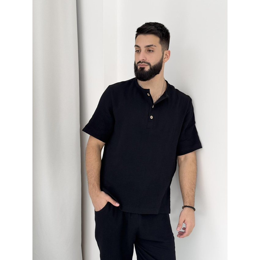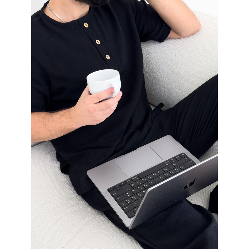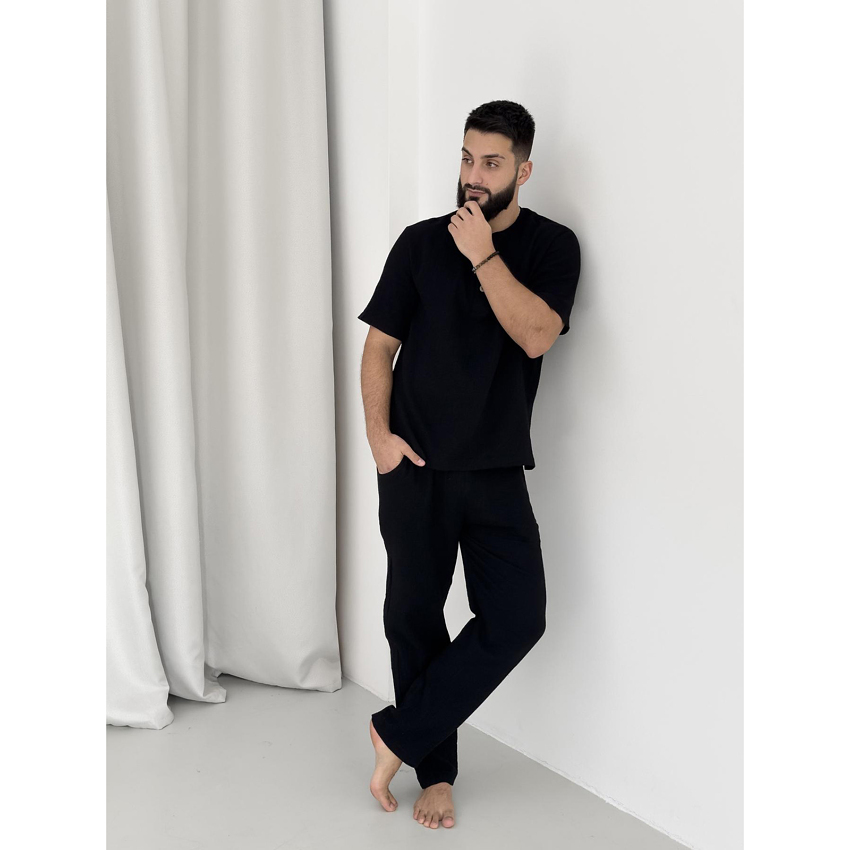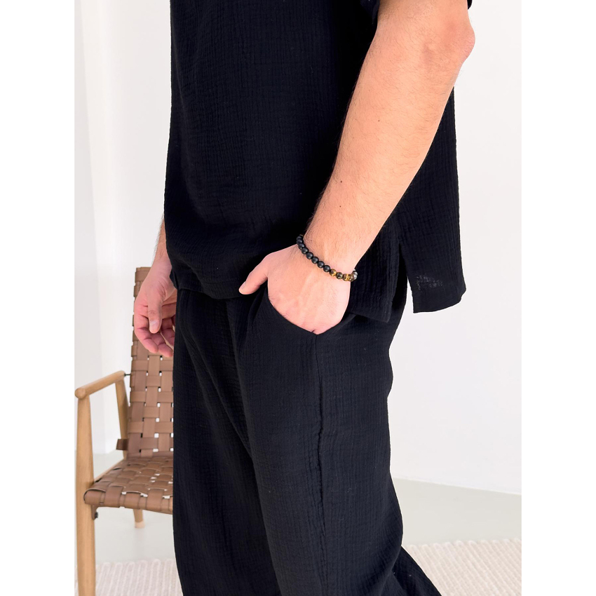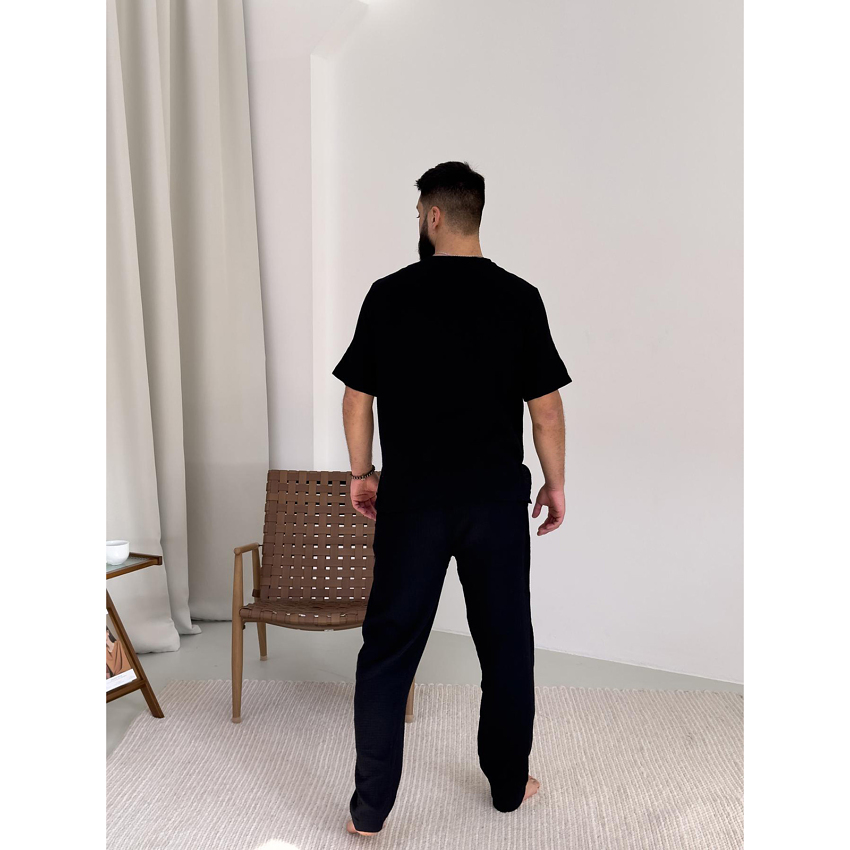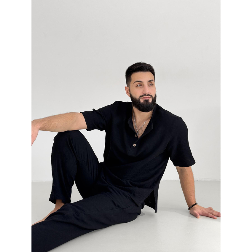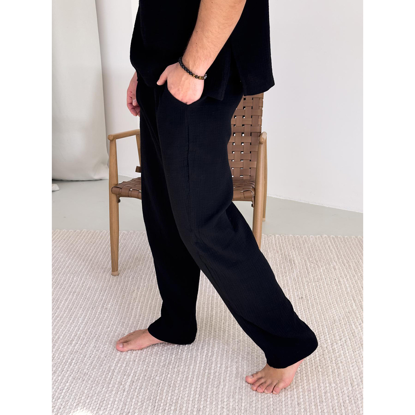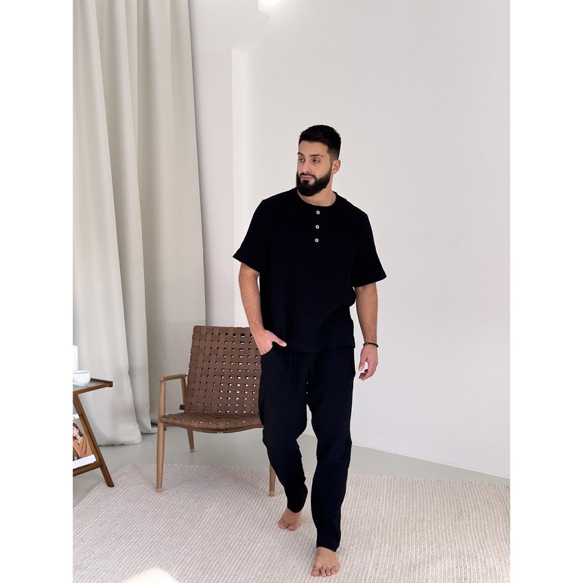 Комплект "Capri" – це універсальний вибір, який виглядає стильно як у домашній атмосфері, так і на вулиці. Відвідуєш кафе з друзями чи просто гуляєш парком – у цьому комплекті ти завжди виглядатимеш доречно. Муслінова тканина, натуральна і гіпоалергенна, робить його ідеальним вибором для чоловіків в літку.
