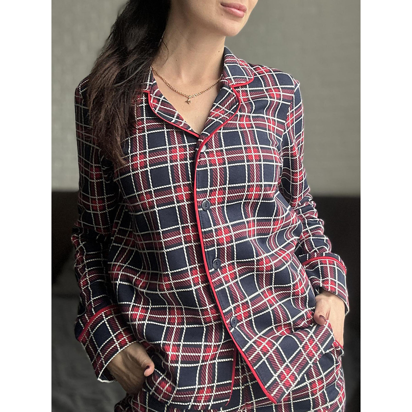 - Класичний принт у червоно-синю клітинку з елегантною контрастною окантовкою червоного кольору;
