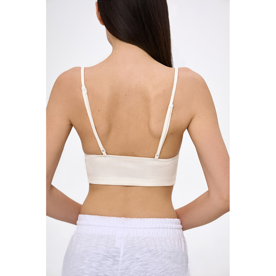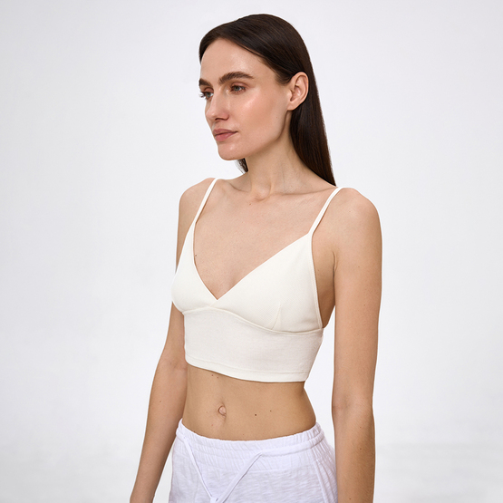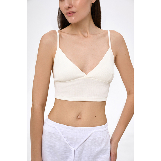 Укорочений жіночий топ з подвійною чашкою без кісточок. На тонких регульованих бретельках. Без застібок. Тканина - трикотаж в рубчик.