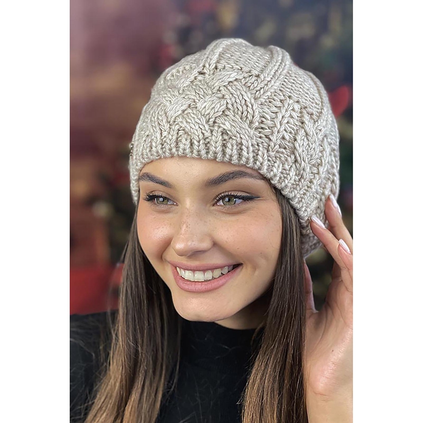 В'язана шапка «Камелія» - модний жіночий головний убір одинарного типу. Додаткове обігрів забезпечує якісна флісова підкладка. Виріб створений з використанням товстої візерункової в'язки. Шапка прикрашена логотипом та невеликими стразами. При створенні виробу застосовується шерсть альпаки та мериноса. Незважаючи на те, що шапка одинарна, вона дуже тепла, підходить для суворої зими.