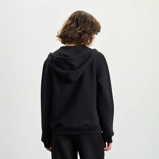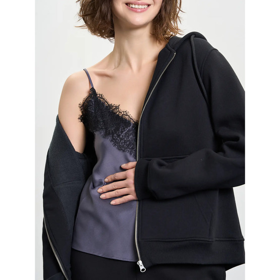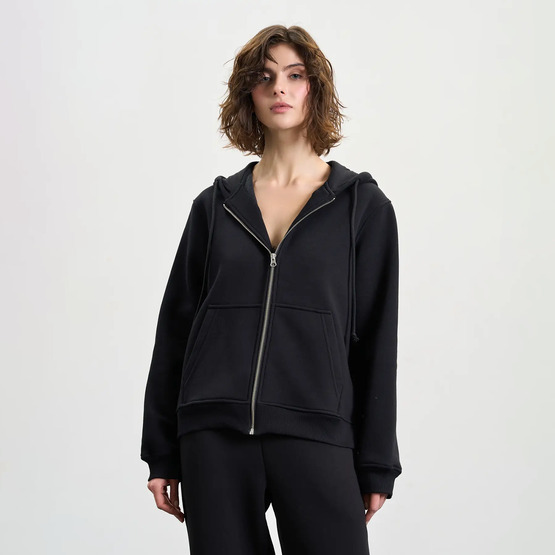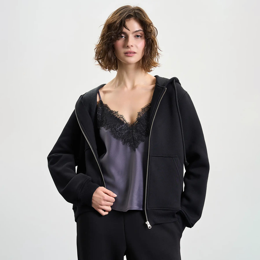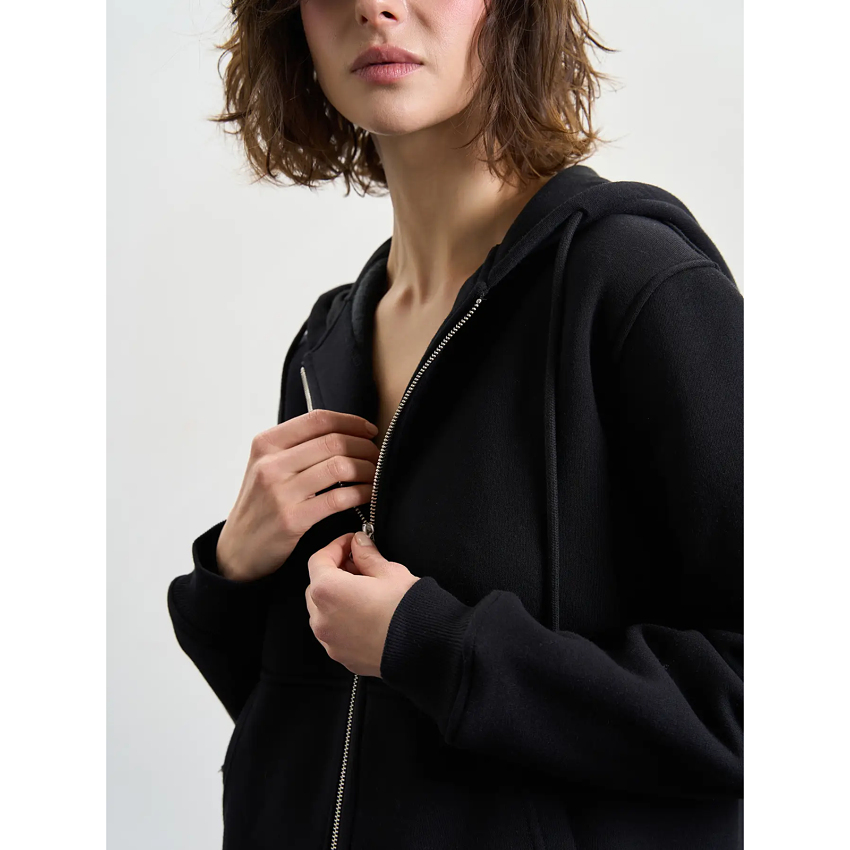 Зимове жіноче зіп-худі на металевій блискавці — теплий і практичний вибір для холодної пори року. Модель із капюшоном на шнурках забезпечує додатковий захист від вітру. Класичне плече додає лаконічності, а накладні кишені підкреслюють функціональність. Стандартний крій та довжина гарантують комфорт і універсальність у повсякденному носінні.