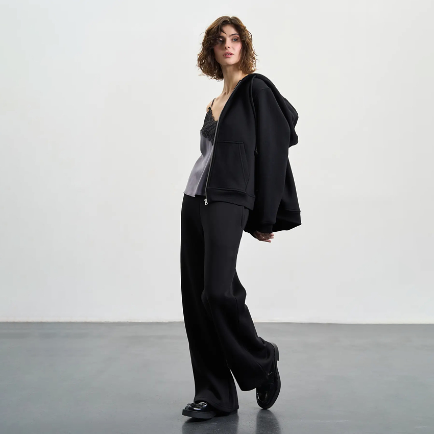 Зимові теплі жіночі штани прямого широкого крою створені для максимального комфорту та затишку в холодну пору року. Модель оснащена зручним поясом на резинці зі шнурком, що дозволяє легко регулювати посадку. Штани мають місткі бічні кишені та невелику накладну кишеньку ззаду для додаткової практичності. Завдяки універсальному дизайну вони легко поєднуються з різними стилями одягу та підходять для створення як повсякденних, так і спортивних образів.