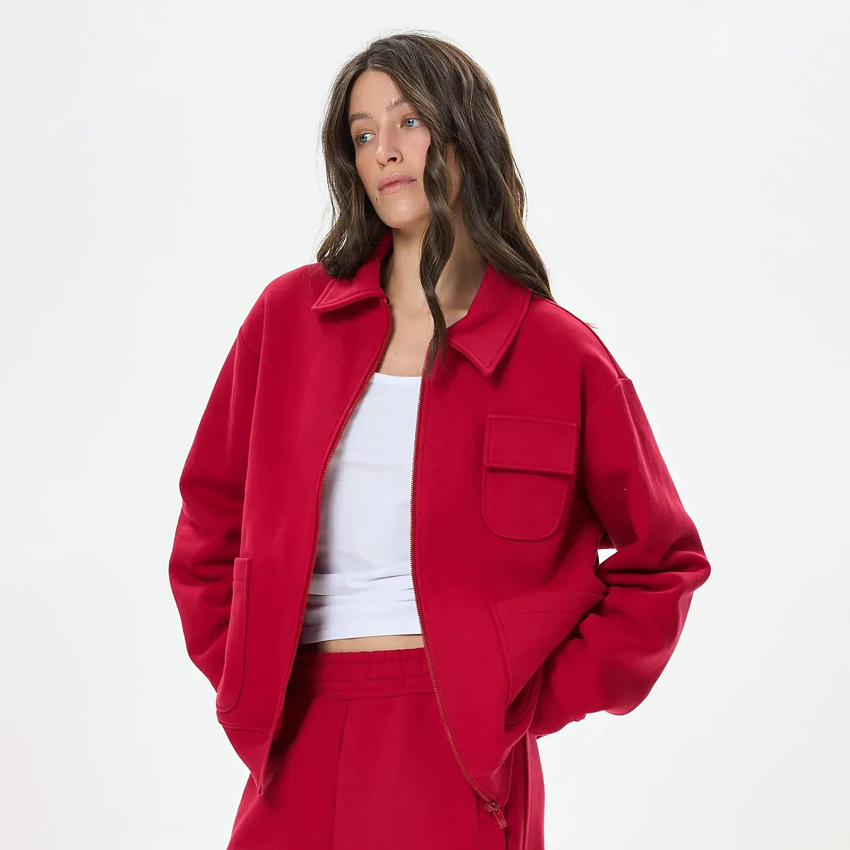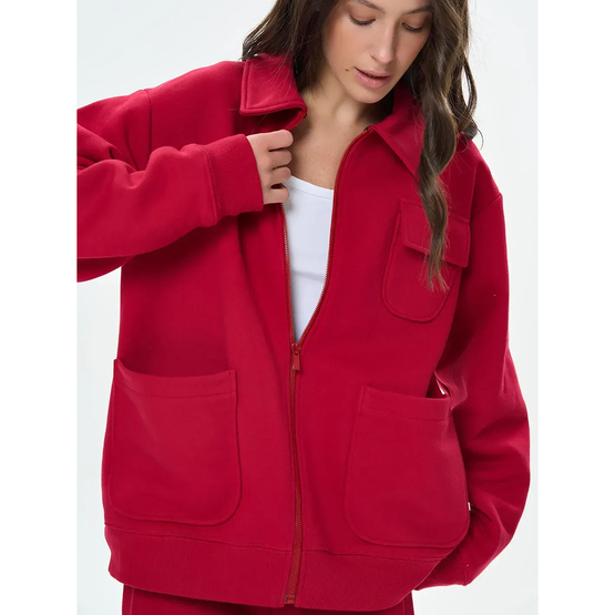 Жіночий утеплений бомбер із футеру з начісом поєднує стиль та функціональність. Модель застібається на блискавку, має відкладний комір і манжети на рукавах та по низу, що забезпечує зручну посадку. Дві бічні накладні кишені додають практичності, а невелика нагрудна кишенька з клапаном підкреслює характерний акцент у дизайні. Теплий і універсальний, цей бомбер стане чудовим вибором для повсякденних образів у прохолодну погоду.